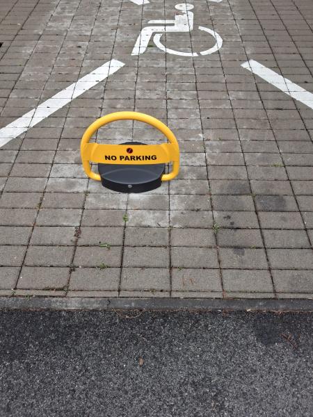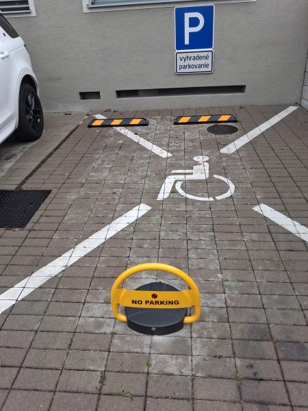 Tentokrát si klientka vybrala automatickú parkovaciu zábranu na diaľkové ovládanie so solárnym nabíjaním batérie a požiadala aj o montáž parkovacích dorazov s retroreflexným značením, ktoré sa používajú pre zaistenie bezpečného parkovania.